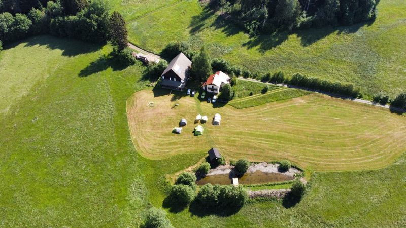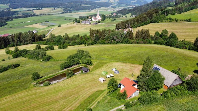 Vor dem Häuschen ist eine große Wiese, die auch als Zeltwiese verwendet werden kann. Ein Teich als Naturidyll für Molche, Libellen und andere seltene Tierarten grenzt die Wiese im Süden ab. Der Ausblick in die weite, vom Gletscher geformte Hügellandschaft des Region Murau ist wunderbar, der Sonnenuntergang jedes Mal ein Naturereignis. Eine Lagerfeuerstelle, Sanitäranlagen mit einfachen Duschen und Toiletten und bei Bedarf auch eine kleine Küche stehen bereit.